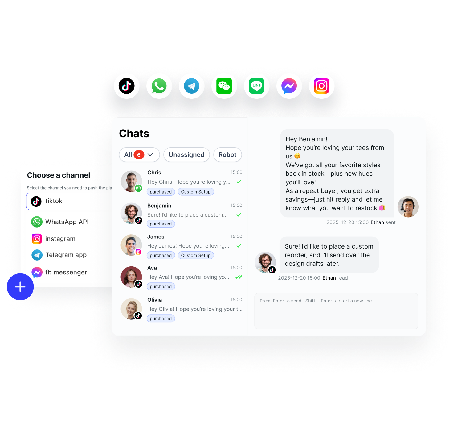 Send messages to multiple channels simultaneously, including WhatsApp, Messenger, Instagram, and TikTok, with a single click, ensuring consistent content and improving reach efficiency.
