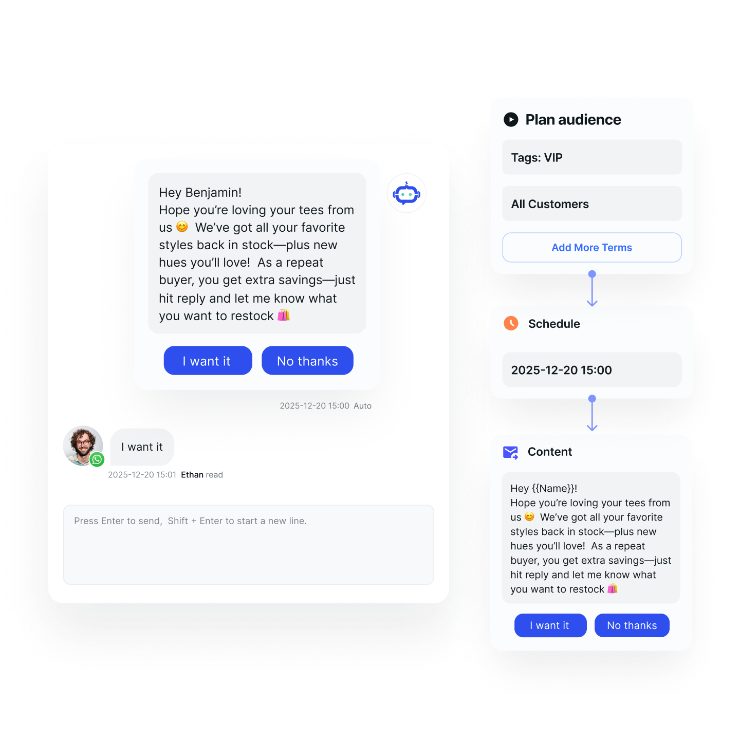 By automatically inserting customer names, product information, and other details using variable templates, each mass message feels like a personalized conversation, improving customer satisfaction and interaction rates.